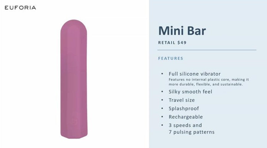 • Includes: Mini Bar Full Silicone Massager, Directions Card, USB Charging Cord