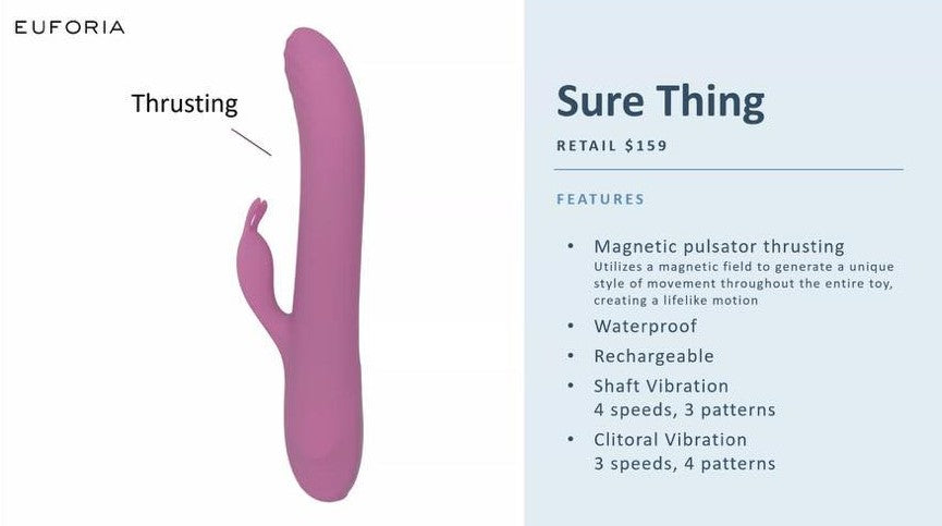 It may look familiar, but this feature-packed dual-action bedroom tool isn’t like other vibrators. With a vibrating rabbit teaser and unique pulsator thrusting action, Sure Thing is one unforgettable ride.